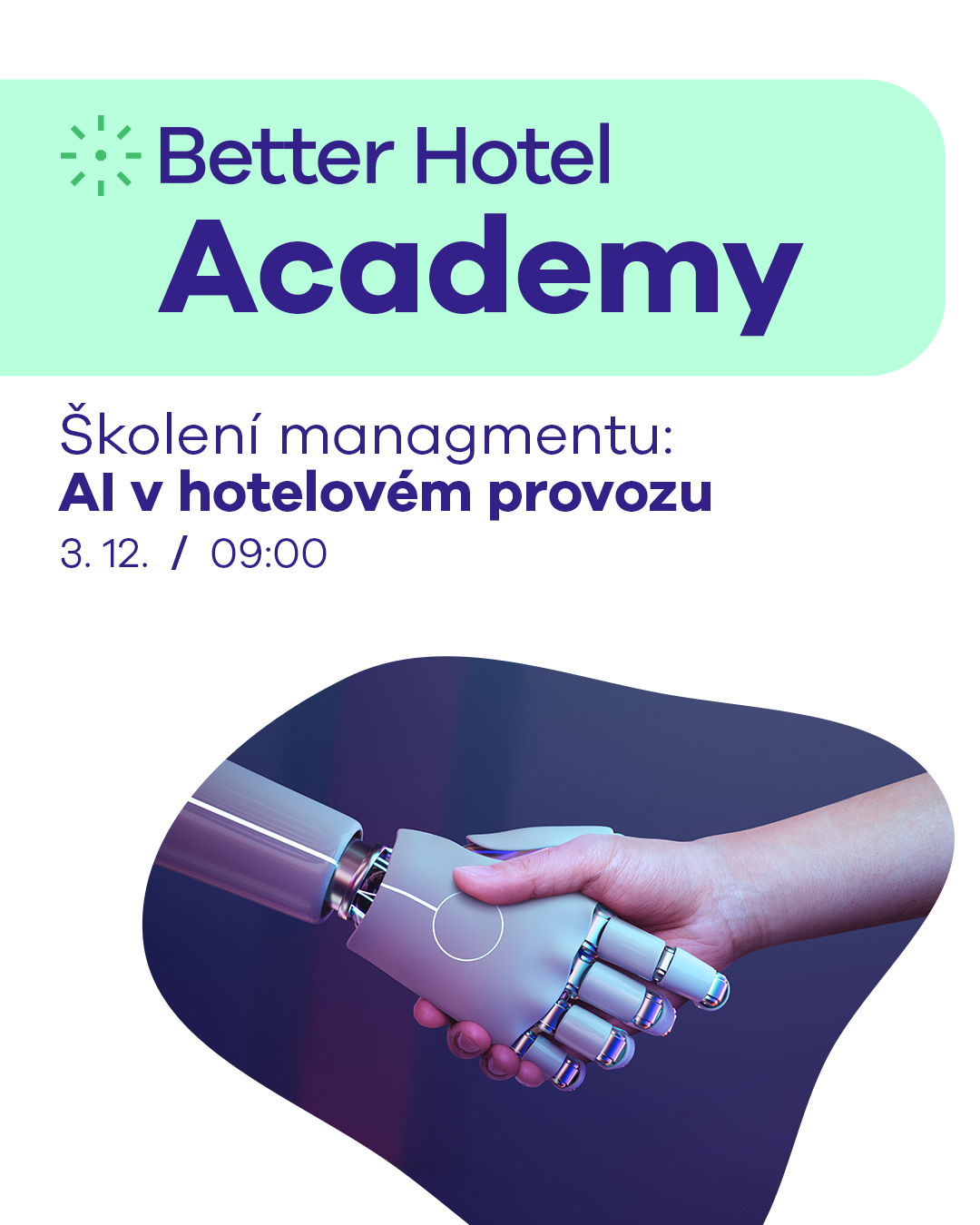 Poslední akce Better Hotel Academy v tomto roce, se uskuteční ve středu 3. prosince 2025. Tento den proběhne Školení managementu a novinkou bude odpolední odborná mini konference zaměřená na téma AI a její využití v oblasti hospitality.