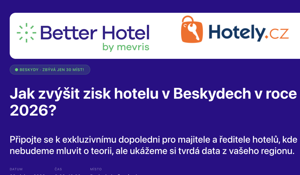 Boj o hosta v Beskydech přitvrzuje. Přijďte na exkluzivní dopoledne pro majitele hotelů a odneste si tvrdá regionální data. Ukážeme vám, jak vykrýt prázdné všední dny a jak pomocí AI snížit personální náklady. Kapacita je striktně omezena na 35 míst.